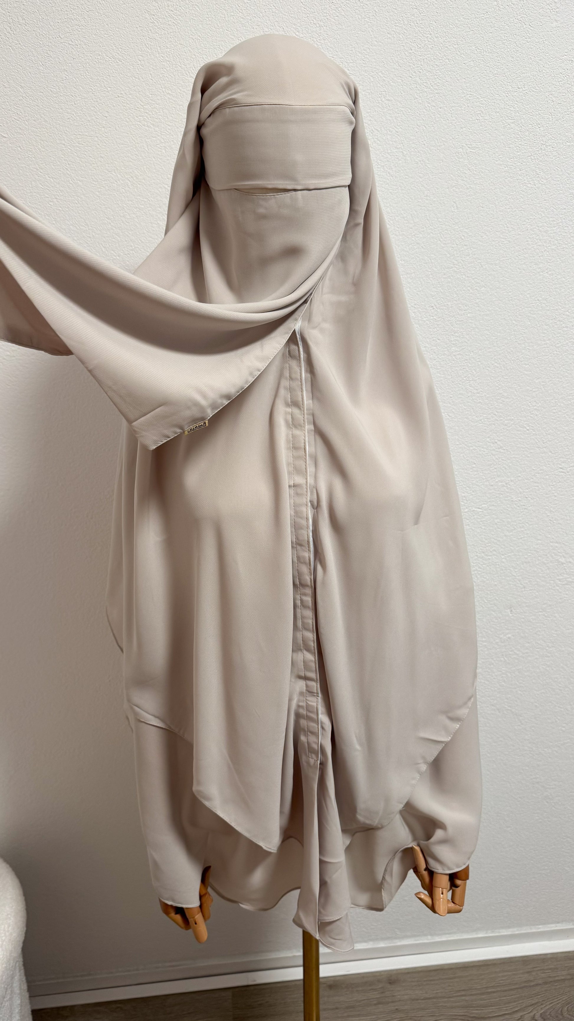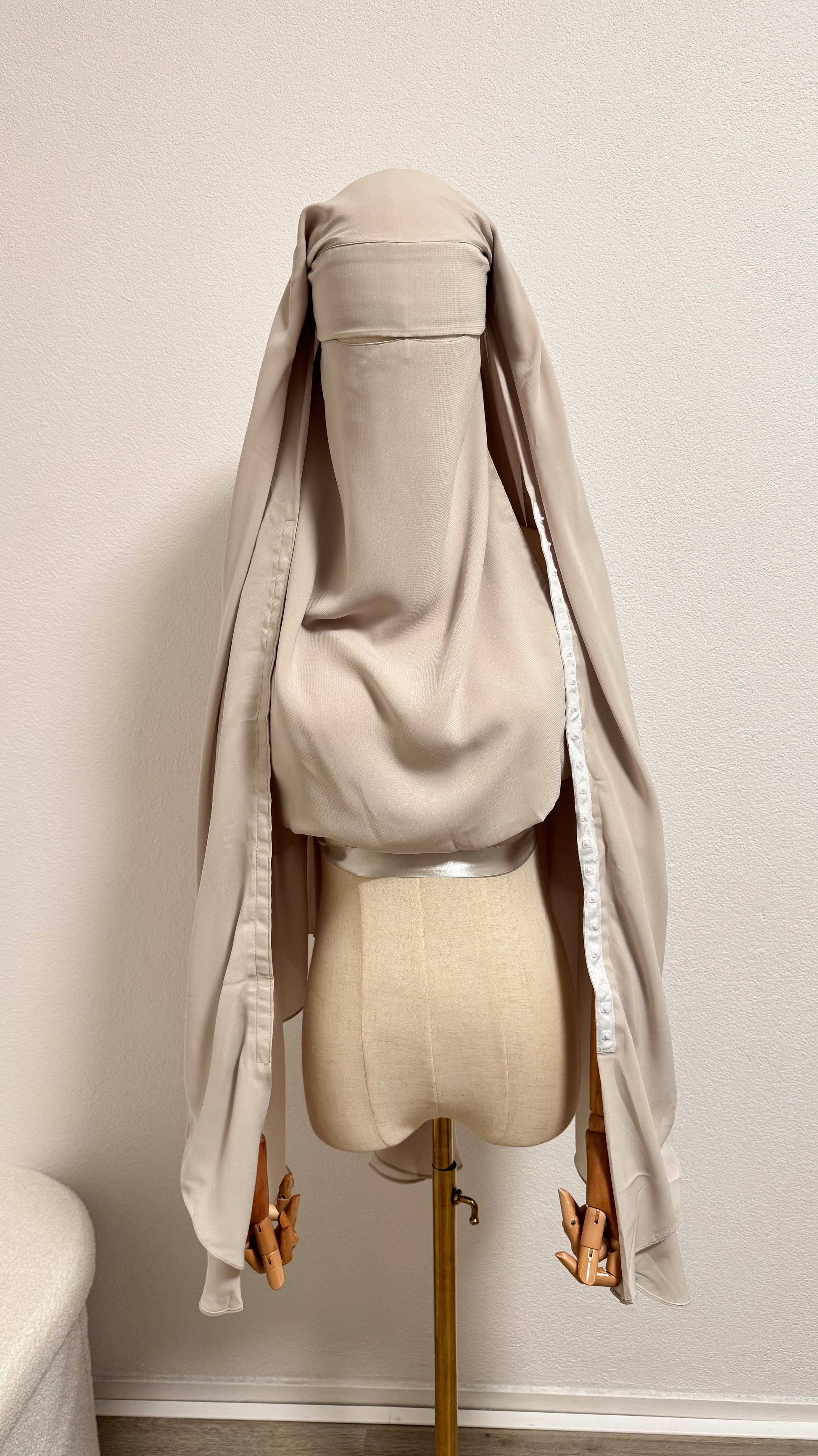 Egyptian-made niqab crafted from premium Saudi chiffon with secure clips for reliable wear. Includes full veil, protective flap, and adjustable nose string. Cream shade.
